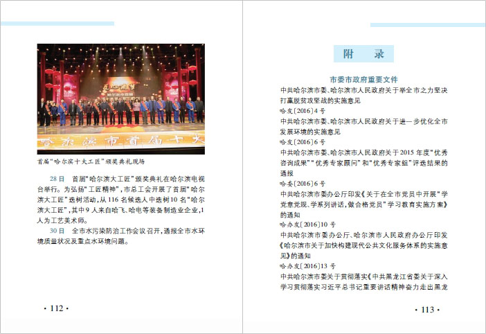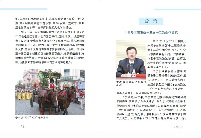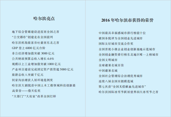 简 介: mobile.bet.365围绕市委、市政府2016年中心工作,精心设计编写了《哈尔滨市情手册(2017)》。全书分为“基本情况”“政治”“经济社会发展”“大事记”“附录”五个部分,其中“基本情况”包括位置、面积、地形、水文、土壤、矿产、林产、植物、动物、旅游、气候、人口、民族、宗教、方言、民俗、行政区划,以及全市性重大活动。“政治”载入了市委十三届十二次全体会议、十四次代表大会、十五届人大一次会议、十二届政协一次会议,以及领导干部名录等内容。“经济社会发展”包括数字看哈尔滨、2016年经济指标、2012~2016年政府工作报告看哈尔滨、65项惠民行动项目以及城乡居民幸福度调查。“大事记”包括年度内社会各领域有载录价值的新事、要事、特事。“附录”选录了市委市政府重要文件、市政府规章、市政府规范性文件、哈尔滨之最、市第五批市级非物质文化遗产名录、湿地景区名录、市工农业旅游景区示范点、哈尔滨方言中的俄语词汇、历史上各国在哈尔滨设立的领事馆、哈尔滨市代表性街路新旧街名一览表、历史上哈尔滨知名电影院、历史上哈尔滨知名教堂,以及2016年mobile.bet.365工作纪事等资料。图片专题记载历史性时刻、哈尔滨市获得的荣誉、哈尔滨亮点。 |